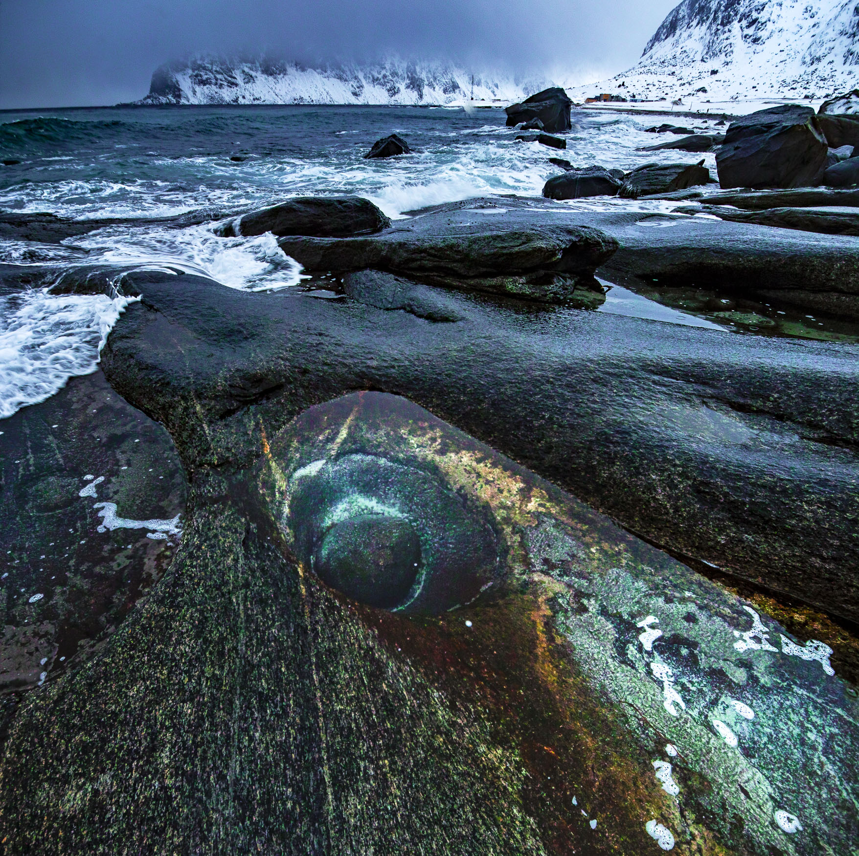 Dragon's Eye Uttakleiv Beach ░ Drachenauge genannter Felstümpel am Strand von Uttakleiv