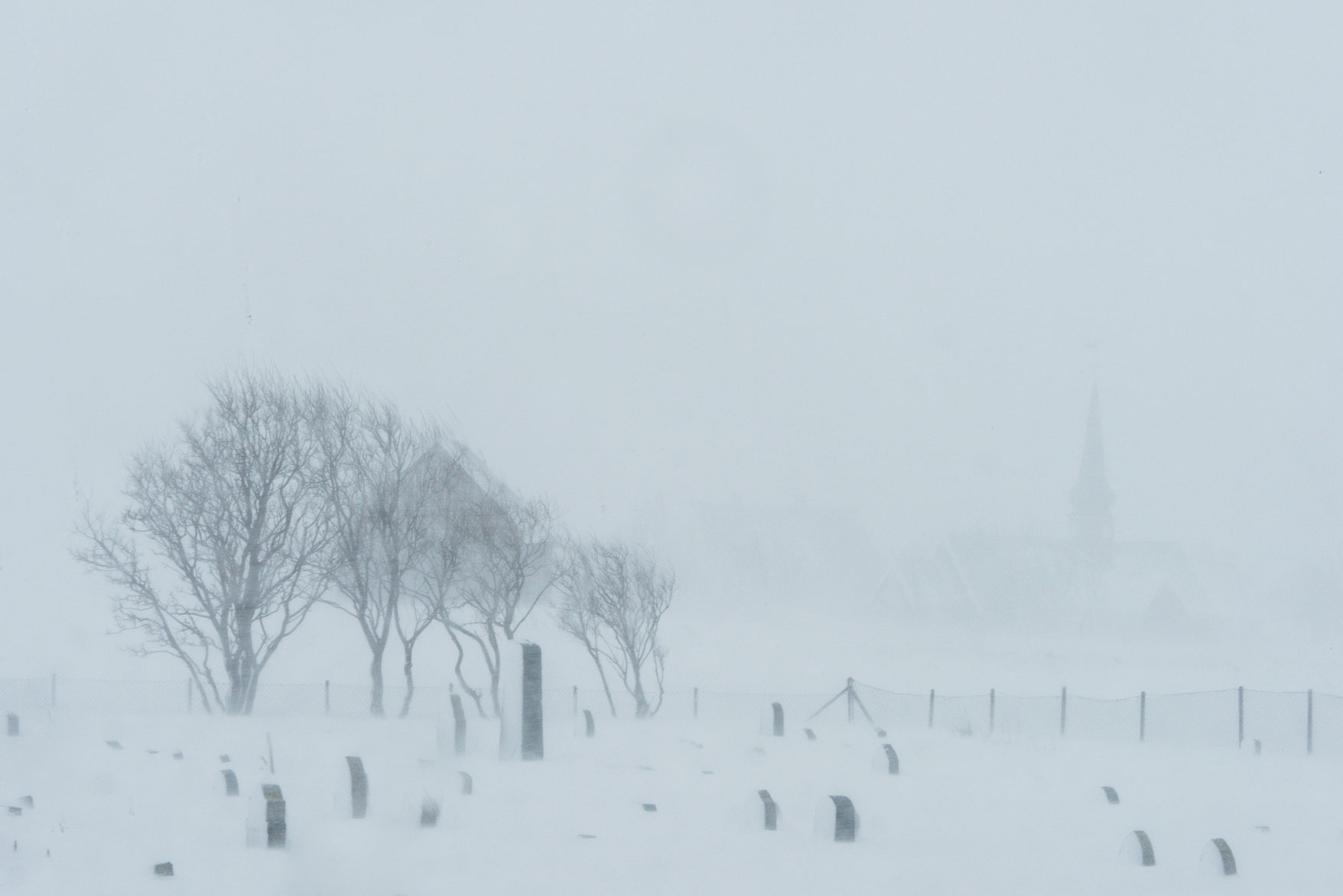 Flakstad church in Snow storm ░ Friedhof und Kirche von Flakstad bei Schneesturm