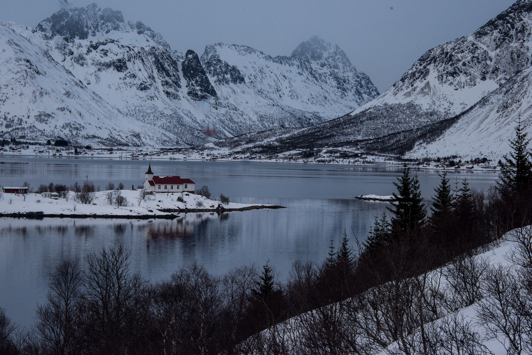 Flakstad church in Snow storm